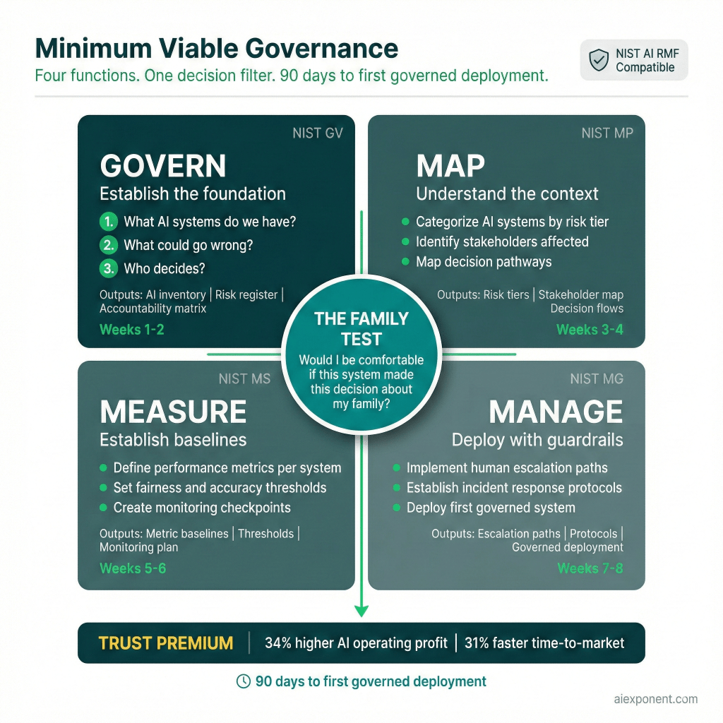 Minimum Viable Governance is not a competing framework. It’s an implementation architecture built on the same four core functions as the NIST AI Risk Management Framework — Govern, Map, Measure, Manage — with a fundamentally different philosophy: start governing now, with the smallest complete structure that works, and build maturity through practice rather than planning.