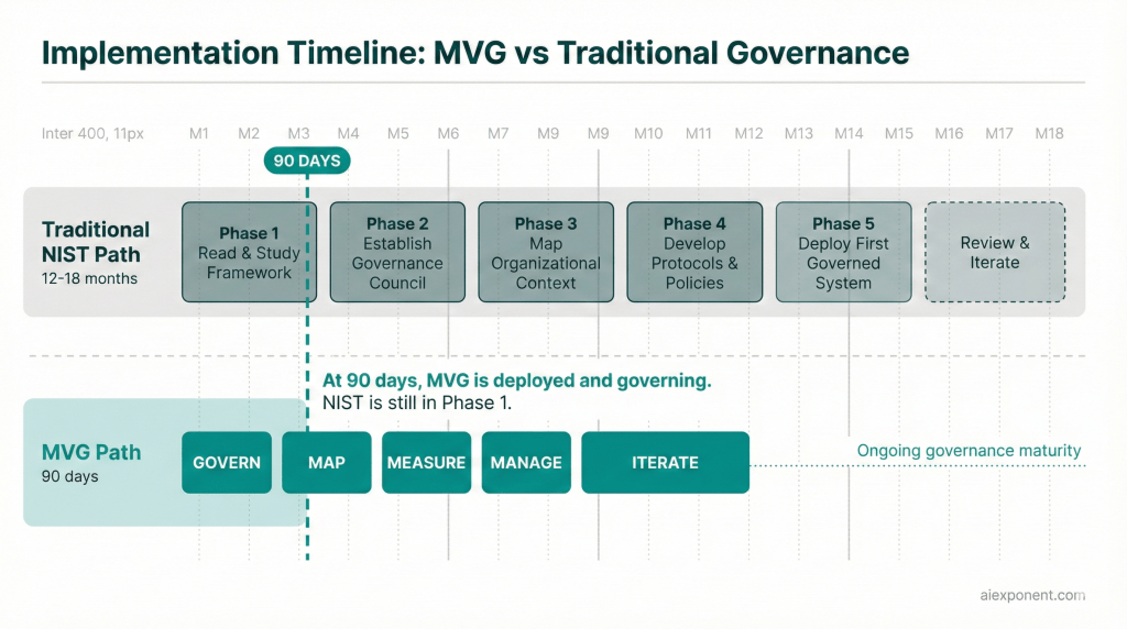 The competitive dynamics make this concrete. Two companies of similar size, both deploying AI-driven customer service. Company A implements full NIST-aligned governance before deployment. Twelve months in, they are still mapping risks. Company B implements MVG. In 90 days, they have a governed system in production: an AI inventory, risk tiers, a designated governance owner, monitoring protocols, and a human escalation path. By month three, Company B is serving customers, collecting performance data, and iterating on governance based on actual operating experience. Company A is still in committee.